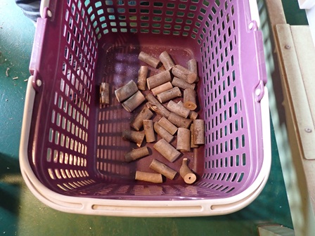 間伐材をクラフトに使う長さに切って加工した後、